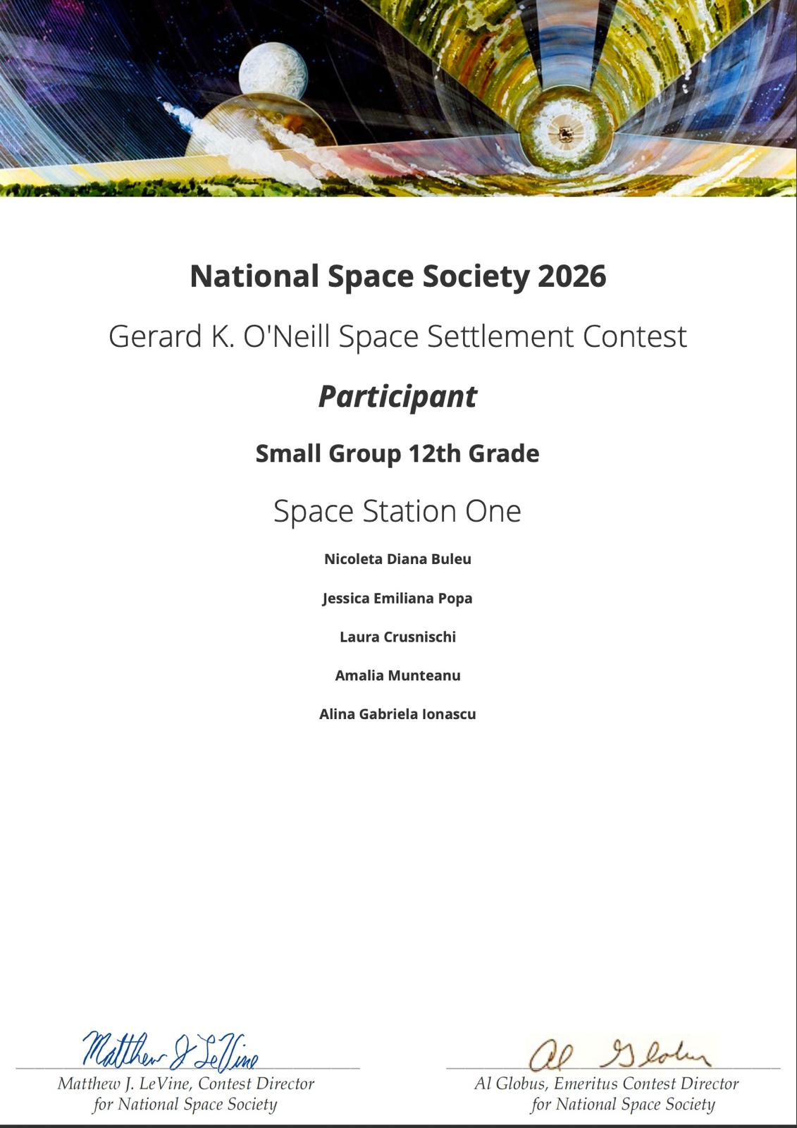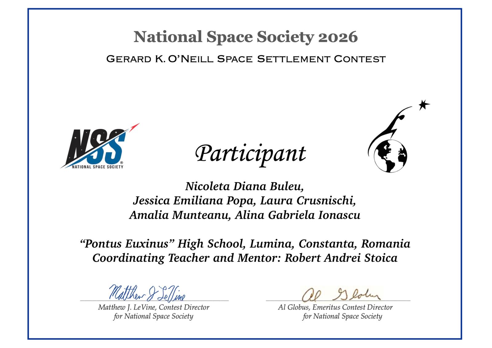 National Space Society din Statele Unite ale Americii le-a acordat certificate de participare elevilor de la Liceul Teoretic „Pontus Euxinus”, Lumina, județul Constanța, cu ocazia participării la celebrul concurs Gerard K. O’Neill Space Settlement Contest 2026. Această competiție internațională a reunit 29000 de elevi cu 4900 de proiecte, din 31 de țări din întreaga lume, între care s-au remarcat elevele: Diana Buleu, Jessica Popa, Laura Crusnischi din clasa a XII-a, Amalia Munteanu din clasa a XI-a și Alina Ionașcu din clasa a X-a. Concursul la care a participat echipa coordonată de către profesorul Robert-Andrei Stoica „a fost sponsorizat de NASA Ames Research Center în perioada 1994-2018, pentru mulți dintre acești ani în colaborare cu National Space Society (NSS). În 2019, sponsorizarea a fost transferată integral Societății Naționale Spațiale.” (https://nss.org/nss-space-settlement-contest/news/)
